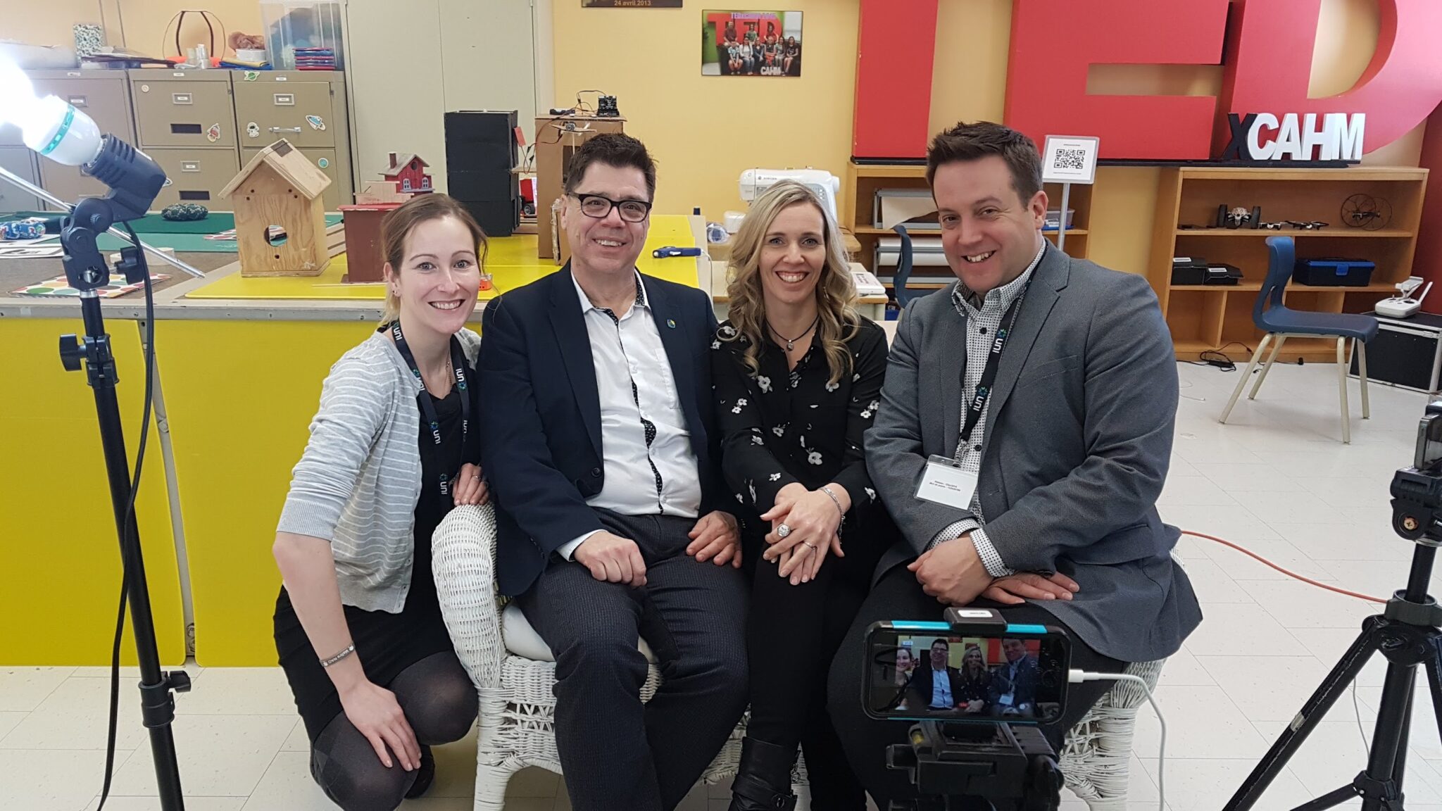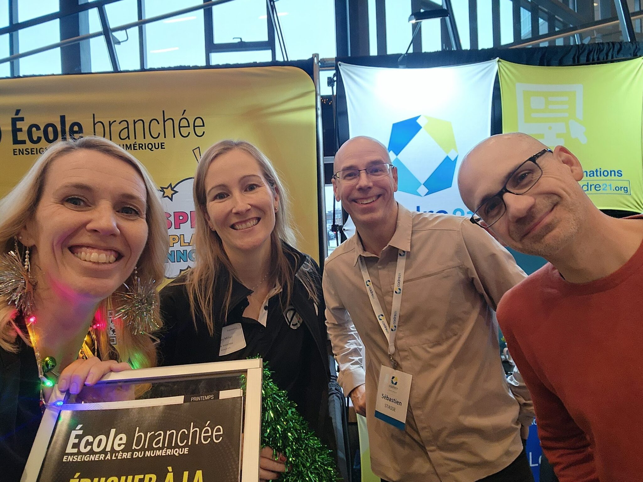 Le saviez-vous? De nombreuses entrevues vidéos de la série Les Rendez-vous pédagogiques ont été réalisées en collaboration avec l’équipe du CADRE21… avant la pandémie de COVID-19! Ici, en 2018 lors de l’événement Clair, avec Audrey Miller (École branchée), Jacques Cool (CADRE21), Stéphanie Dionne (École branchée) et Pascal Provost (CADRE21).