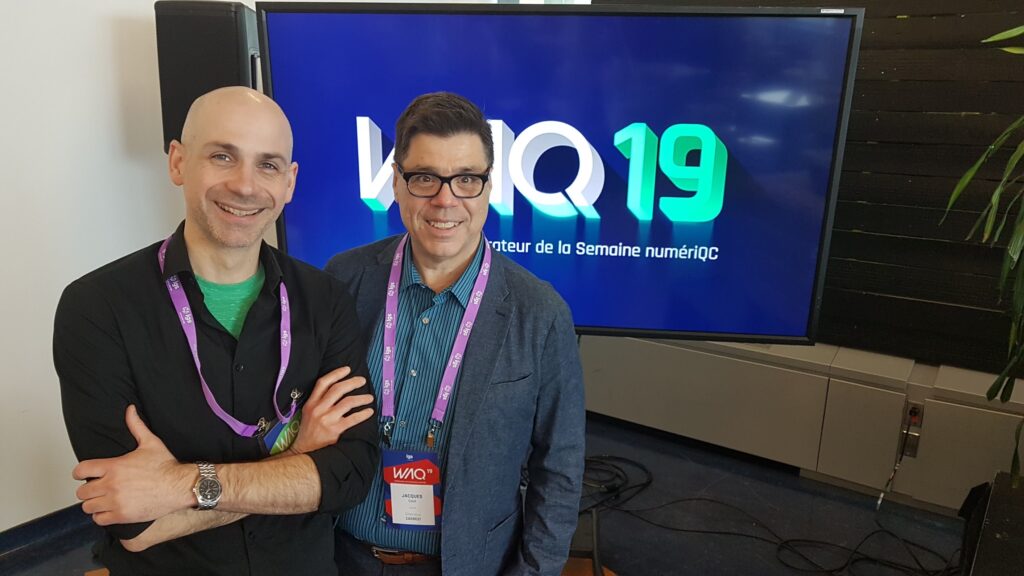 Ici, en coulisses d’une conférence de Jacques Cool pour présenter le modèle du CADRE21 au Web à Québec (WAQ) en 2019, avec Maxime Pelchat.