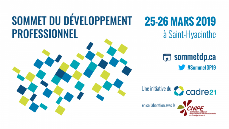 Les 25 et 26 mars 2019 à Saint-Hyacinthe, les intervenants en éducation au Québec sont conviés à réfléchir sur le développement professionnel des enseignants. Il s’agit d’une initiative du CADRE21 en collaboration avec le CNIPE qui vise à aller au-delà des constats qui ont émergé lors du premier sommet du développement professionnel (voir le bilan 2018).