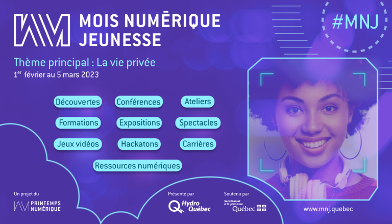 Communiqué – Le Mois Numérique Jeunesse (MNJ) est de retour pour une 4e édition du 1er février au 5 mars 2023. Ce rendez-vous annuel des moins de 35 ans permet de découvrir les initiatives québécoises en littératie numérique et de s’informer sur les domaines d’avenir. Une variété d’activités est inscrite au calendrier sur le site de l’événement MNJ.QUEBEC (spectacles, gaming, hackathon, expositions, ateliers, conférences, etc.)!