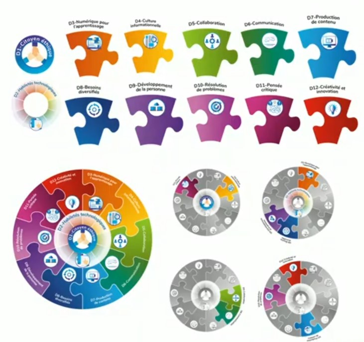 - Regroupe dimensions 3 (Numérique pour l’apprentissage), 9 (Développement de la personne), 2 (Habiletés technologiques), et 8 (Besoins diversifiés)