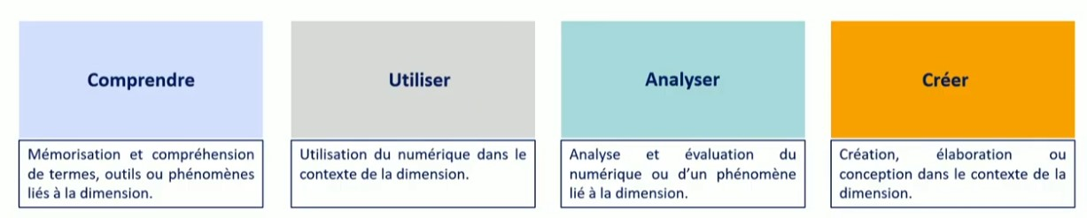 L’ancienne présentation laisse place à des éléments de développement organisés en quatre paliers de progression inspirés de la taxonomie de Bloom révisée pour situer l’usage du numérique :