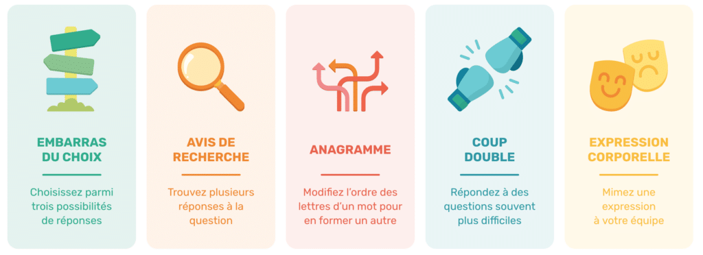 C.A. : Sa grande adaptabilité. Chacune des cinq catégories est un jeu en soi. J’aime pouvoir en choisir une seule selon le temps que j’ai, l’énergie du groupe et le niveau de connaissances. Je ne jouerai pas de la même façon avec des élèves de 5e secondaire ou avec une classe en adaptation scolaire. Le groupe est turbulent? La catégorie Embarras du choix permet justement d’éviter les embarras! Avec ses questions à choix multiples, le groupe n’a pas le temps de se désorganiser. Ou encore, si un élève a passé toute la période à faire le singe, pourquoi ne pas lui proposer de mimer devant la classe une expression de la catégorie Expression corporelle? Voilà une belle façon de joindre l’utile à l’agréable!
