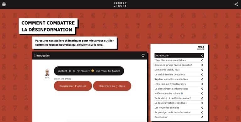Nous l’avons consulté, et on peut dire que cet outil a un petit quelque chose d’interactif et de vraiment accrocheur! D’entrée de jeu, on y est invité à converser (« chatter », en bon français) avec un « chatbot » (un robot conversationnel) qui personnifie l’animateur de l’émission Décrypteurs à RDI, Alexis De Lancer. En répondant à ses questions et en relevant ses défis, on peut développer ses habiletés à repérer les fausses nouvelles qui circulent sur le web et, donc, à s’en protéger.