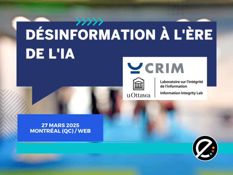 Le CRIM et l’Université d’Ottawa organisent une journée sur la lutte contre la désinformation à l’ère de l’IA le 27 mars 2025. L’événement réunira experts, journalistes et éducateurs pour discuter des impacts de la désinformation sur la politique, les médias et la démocratie. Au programme : panels thématiques, démonstrations d’outils de détection et discussions sur l’éducation à l’information.