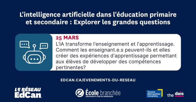 Le Réseau EdCan, en partenariat avec The Dais et l’École branchée, organise une série d’événements virtuels réunissant des chercheurs de premier plan et des professionnel(le)s de l’éducation pour explorer certaines des grandes questions entourant l’IA dans l’éducation primaire et secondaire.