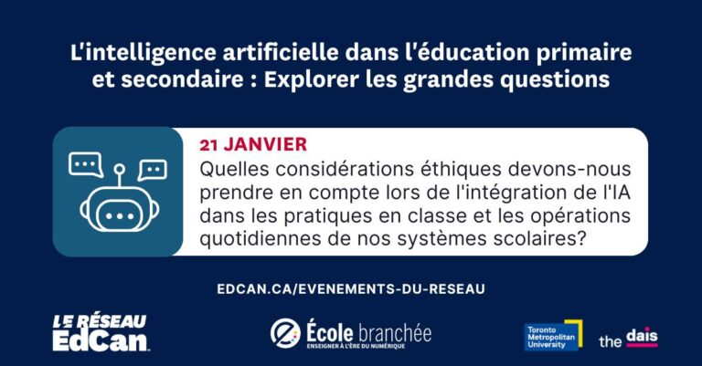 Le Réseau EdCan, en partenariat avec The Dais et l’École branchée, organise une série d’événements virtuels réunissant des chercheurs de premier plan et des professionnel(le)s de l’éducation pour explorer certaines des grandes questions entourant l’IA dans l’éducation primaire et secondaire.