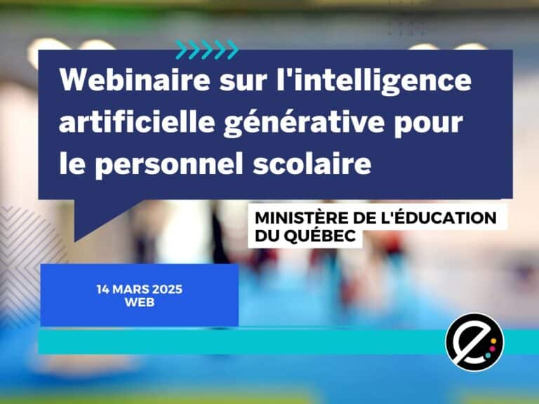 Le Ministère de l’Éducation du Québec propose au personnel scolaire un webinaire destiné aux enseignants, conseillers pédagogiques, gestionnaires scolaires et étudiants en enseignement. Cet événement en ligne vise à présenter le potentiel pédagogique de l’intelligence artificielle générative, à faire découvrir le guide sur son utilisation pédagogique, éthique et légale, et à donner des outils concrets.