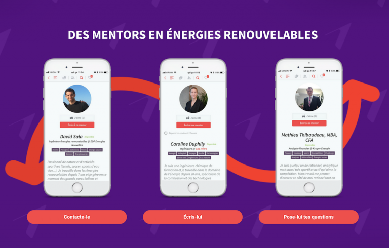 Au terme de leur expérience sur le microsite, les jeunes sont invités à contacter un mentor œuvrant dans le secteur des énergies renouvelables. D’ailleurs, Academos lance un appel à tous les professionnel-le-s œuvrant dans le secteur des énergies renouvelables à devenir mentor sur la plateforme Academos et ainsi transmettre leur passion.