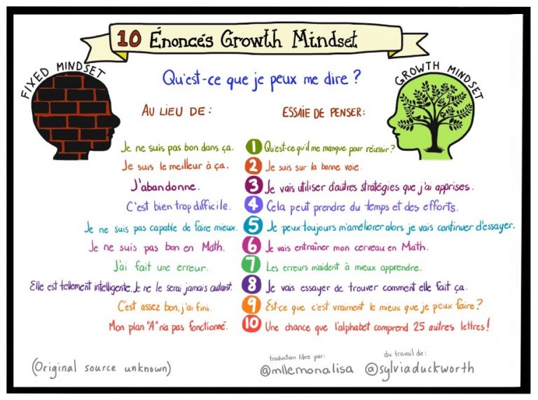 Le « growth mindset » est un terme de plus en plus utilisé en éducation, qu’on traduit en français par « mentalité de croissance ». Valérie Poirier nous a présenté ce concept et des idées afin de l’intégrer à nos pratiques. Elle définit la mentalité de croissance comme étant un état d’âme qui amène l’apprenant, de tout âge, à croire au développement de ses capacités et à voir les défis, les obstacles, les efforts, les rétroactions et les succès des autres comme des alliés à l’atteinte de ses propres objectifs. Elle suggère d’ailleurs sa traduction libre de l’oeuvre de Sylvia Duckworth afin de modifier son schème de pensée vers une mentalité de croissance :