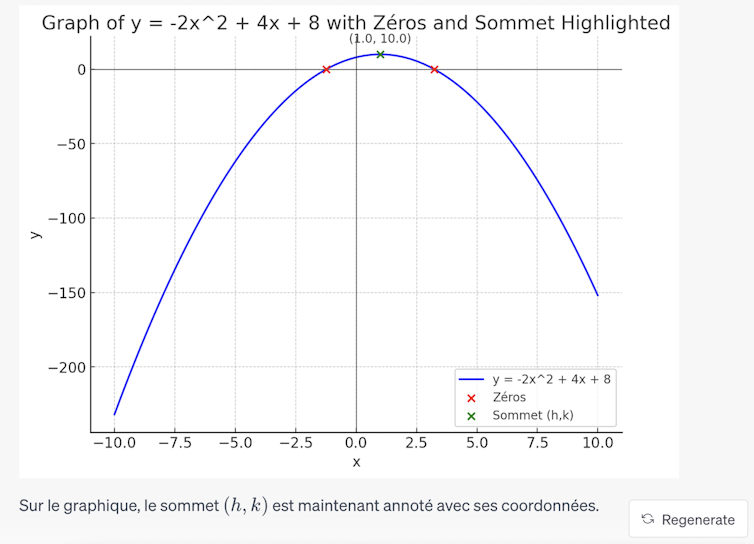 En mathématiques, que ce soit avec le « Code interpreter/Advanced data analysis » ou même avec le puissant plugin « Wolfram », le robot semble pouvoir résoudre à peu près n’importe quel calcul. Il dispose également de capacités graphiques, affichant les solutions, par exemple le sommet et les zéros d’une équation quadratique.