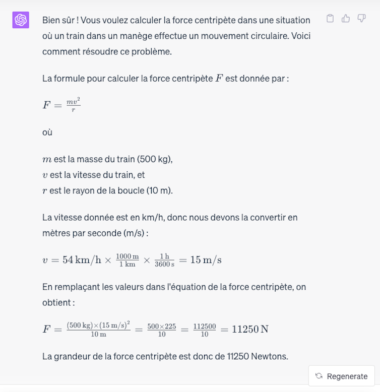 En physique, nous avons commencé nos tests avec un problème simple de calcul de la force centripète, qui implique tout de même d’effectuer des changements d’unités dans les données initiales. ChatGPT comprend bien le problème, explique clairement sa démarche et procède aux divers calculs nécessaires.