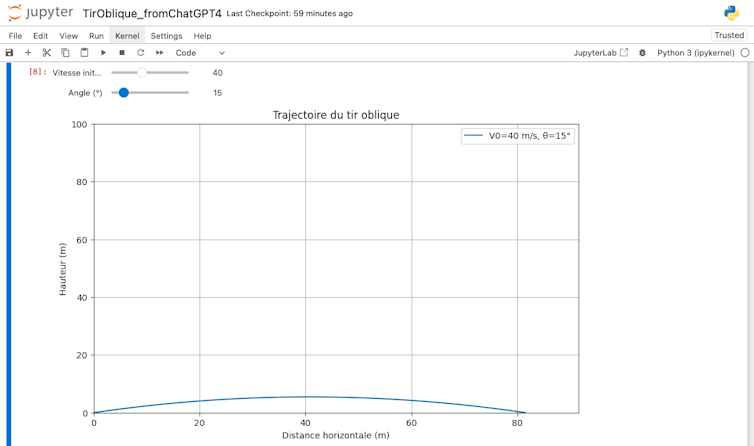 Pour aller encore plus loin après avoir résolu un problème de calcul de trajectoire oblique d’une balle de golf, nous avons demandé à ChatGPT de réaliser un environnement virtuel interactif permettant de mieux visualiser le problème. Le robot nous a d’abord guidés dans l’installation de diverses bibliothèques de code informatique préconstruites. Puis, nous amenant dans l’environnement « Jupyter Notebook », il a programmé un script permettant de créer un simulateur interactif où des curseurs aident à mieux comprendre l’effet de la variation de divers paramètres (comme l’angle ou la vitesse initiale) sur la trajectoire du projectile.