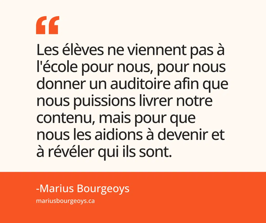 Un oiseau n’a pas besoin d’apprendre à voler, il vole parce que c’est dans sa nature. Une semence contient déjà l’arbre qu’elle est destinée à devenir, à condition d’être placée dans le bon environnement. Mais la semence doit devenir un arbre. Ce n’est que du potentiel. Ce n’est pas un automatisme. De même, notre rôle en éducation est d’aider les jeunes à trouver ce qu’ils ont à offrir au monde. Les élèves ne viennent pas à l’école pour nous, pour nous donner un auditoire afin que nous puissions livrer notre contenu, mais pour que nous les aidions à devenir et à révéler qui ils sont. Nous sommes appelés à être des catalyseurs de potentiel humain.
