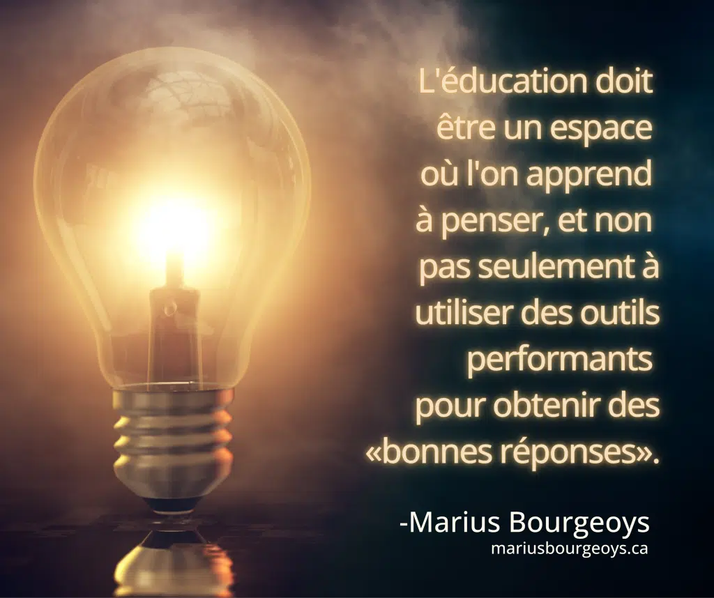 L’éducation a un rôle clé à jouer pour aider les jeunes à trouver leur propre chemin (et à voir le sens de la présence scolaire dans le monde d’aujourd’hui!!!). Plutôt que de leur demander ce qu’ils ont obtenu sur leur dernier travail, posons-leur la question : «Qui veux-tu devenir?» ou «Qui es-tu en train de devenir?» C’est en s’engageant dans cette réflexion qu’ils pourront trouver leur véritable place et contribuer au monde de manière significative. Les élèves viennent à l’école pour se construire. Ils viennent pour eux. Le savent-ils? Ça, c’est difficile. Il est parfois plus facile de continuer la «game» actuelle…