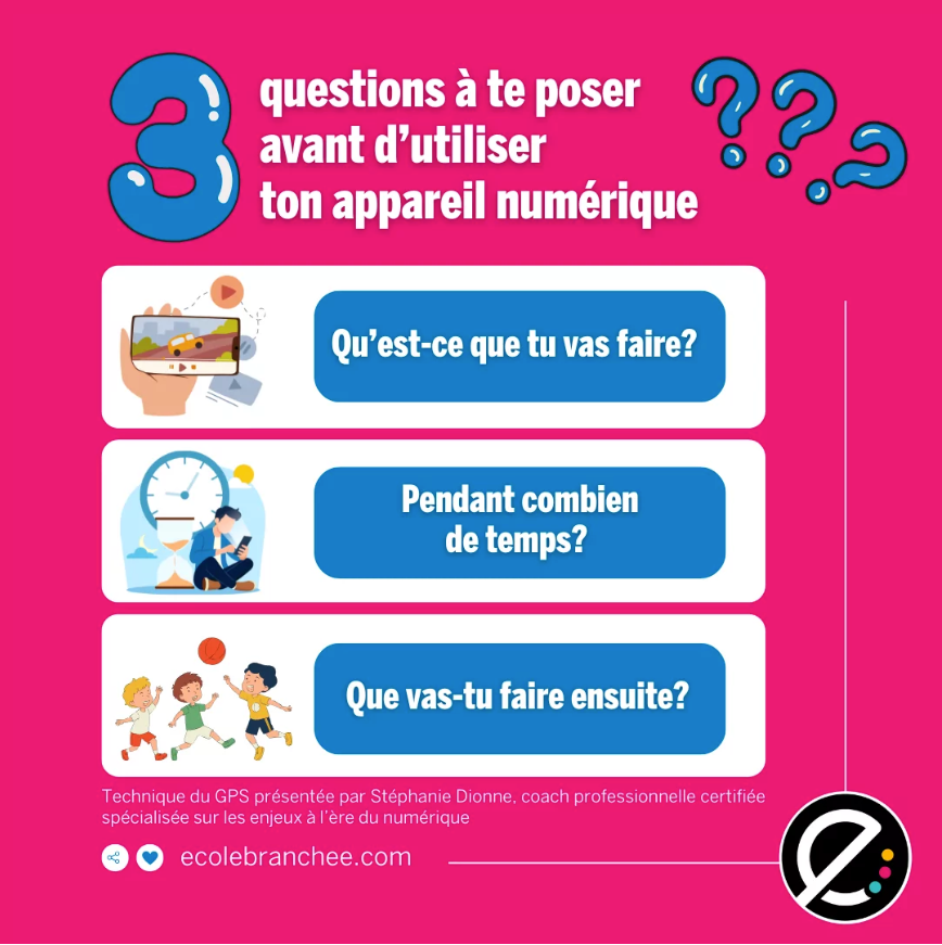C’est un cadre simple, structurant et transférable qui permet aux jeunes de développer un usage réfléchi et équilibré en plus de développer leur autonomie est articulé autour de trois questions :