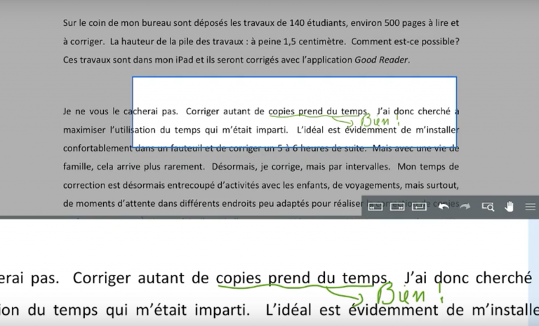 Sur le site de Profweb, il partage son expérience de correction de travaux scolaires avec l’application GoodReader. Il y explique en détail la méthode qu’il a mis en place. Nous vous en faisons un résumé, mais vous encourageons à lire son texte complet si vous désirez tenter l’expérience.
