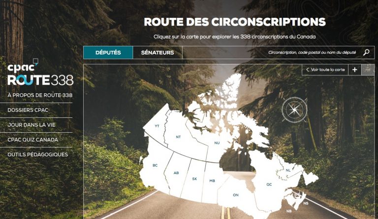 - Le site Web www.route338.ca, qui dresse le portrait des 338 circonscriptions fédérales du Canada au moyen de photos, de faits saillants, et de vidéos provenant de la vaste collection d’archives de CPAC. Par ailleurs, les utilisateurs du site Web découvriront, sous un nouveau jour, le rôle et le travail de leurs élus – et la responsabilité qui accompagne l’exercice d’une responsabilité publique.