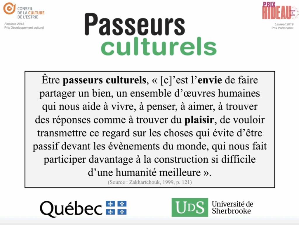 Être passeurs culturels, « [c]’est l’envie de faire partager un bien, un ensemble d’œuvres humaines qui nous aident à vivre, à penser, à aimer, à trouver des réponses comme à trouver du plaisir, de vouloir transmettre ce regard sur les choses qui évite d’être passif devant les évènements du monde, qui nous fait participer davantage à la construction si difficile d’une humanité meilleure » (Zakhartchouk, 1999, p. 121).