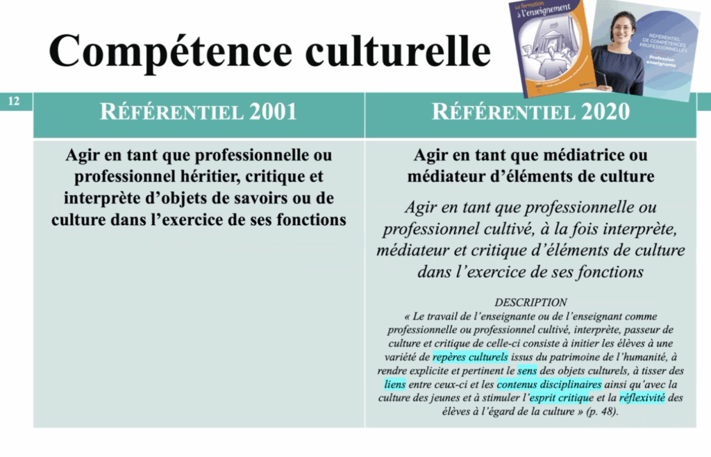 Pour lui, le personnel enseignant a tout intérêt à faire goûter le plus de forme d’art et de culture possible aux élèves. D’autant plus que la compétence 1 du Référentiel de compétences de la profession enseignante est la suivante : Agir en tant que médiatrice ou médiateur d’éléments de culture. Son propos a davantage concerné l’enseignement de la lecture, étant donné qu’il s’agit de son champ d’expertise. Néanmoins, il a mentionné à de nombreuses reprises que cela s’applique à l’ensemble des disciplines scolaires.