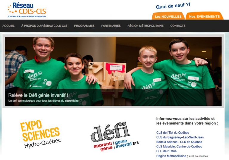 MONTRÉAL, le 15 oct. 2015 /CNW Telbec/ – Le Réseau CDLS-CLS est heureux d’inviter les Québécoises et les Québécois à participer en grand nombre à sa nouvelle saison d’activités scientifiques : Expo-sciences Hydro-Québec, Défi génie inventif ÉTS, Défi apprenti génie, Club des Débrouillards, Les Innovateurs à l’école et une multitude de produits clés en main. Élèves et étudiants, professionnels du milieu de l’enseignement, professionnels du milieu scientifique, parents et passionnés de science pourront participer à nos programmes de plusieurs façons.