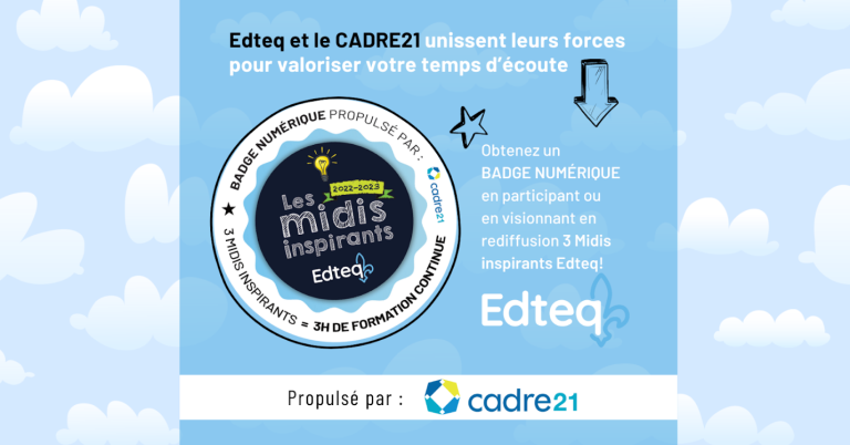 Communiqué – L’Association des Entreprises pour le développement des technologies éducatives au Québec (Edteq) et le CADRE21 annoncent leur partenariat visant à offrir un tout nouveau badge numérique aux participants des Midis Inspirants, une série de discussions en ligne sur l’éducation sous l’angle du numérique.