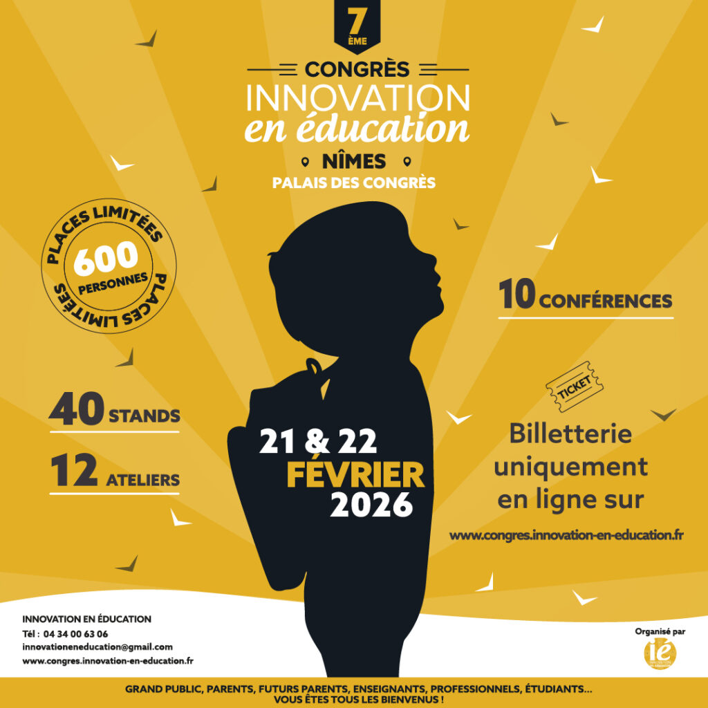 Le 7ᵉ congrès « Innovation en Éducation » se tiendra les 21 et 22 février 2026 au Centre des congrès de Nîmes. L’événement, organisé tous les deux ans dans une ville différente en France, rassemblera 40 exposants, 12 ateliers et 10 conférences autour des pratiques éducatives innovantes.