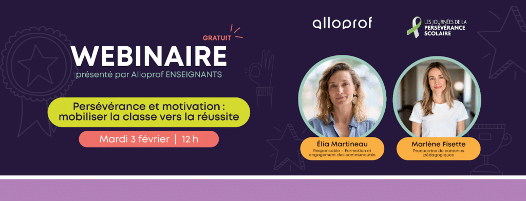 Ce webinaire express d’une durée de 35 minutes présenté par Alloprof Enseignants dans le cadre des JPS 2026 permet d’explorer des stratégies gagnantes pour soutenir l’engagement et la persévérance de chaque élève, tout en développant la motivation et le plaisir d’apprendre au quotidien.