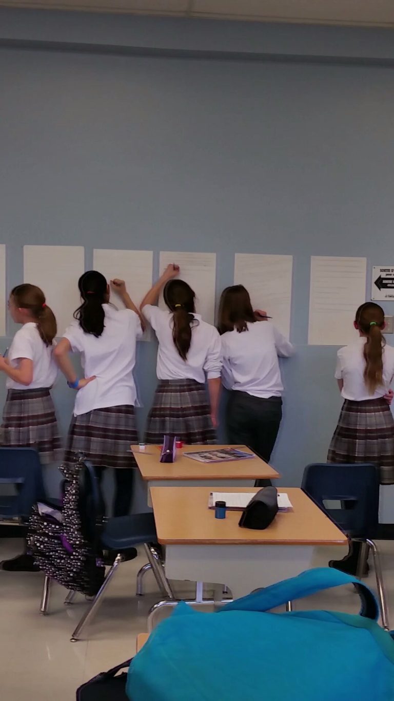 Le logiciel Google Documents, qui permet aux élèves de travailler en collaboration en temps réel et à l’enseignant d’interagir avec ceux-ci, m’a inspirée. En fait, puisque mes élèves n’ont pas leur propre appareil numérique, j’ai décidé de transformer les murs de ma classe en travail collaboratif, ce qui me permet par le fait même de corriger instantanément les erreurs de mes élèves et d’y aller d’explications, d’exemples, etc. La rétroaction est immédiate! Au fond, ma classe devient un gros document Google.