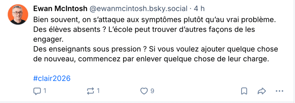 Ewan McIntosh a aussi évoqué un changement de culture marquant. En 2012, rappelle-t-il, la communauté éducative se rassemblait autour du partage d’idées : blogues, liens, réflexions ouvertes, conversations publiques. Aujourd’hui, estime-t-il, nous sommes davantage réunis par l’attention et donc par la distraction. Le contact humain s’amenuise. Les échanges se fragmentent. Et malheureusement, l’école n’échappe pas à cette dynamique.