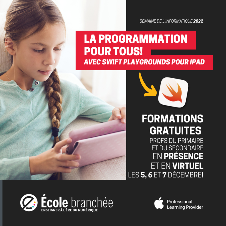 Encore cette année, dans le cadre de la Semaine de l’informatique (Computer Science Education Week), l’équipe de l’École branchée offrira une série d’activités de formation gratuites, axées sur l’enseignement de la programmation, en présence et en virtuel. Voici l’horaire et les liens d’inscription.