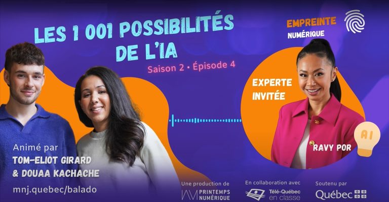 Dans cet épisode, les animateurs Douaa Kachache et Tom-Eliot Girard sont accompagnés de Ravy Por, experte en IA et de plusieurs ados du secondaire. Ensemble, ils abordent la place de l’IA dans notre société et des nombreuses possibilités offertes.