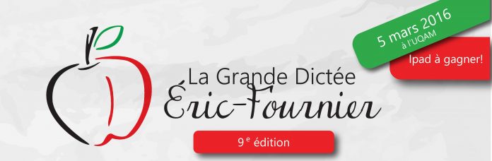 Nous sommes heureux de vous annoncer la tenue de la neuvième édition de la Grande Dictée Éric-Fournier, qui aura lieu le samedi 5 mars 2016, de 9h30 à 15h30 au pavillon J.-A. De Sève de l’Université du Québec à Montréal!