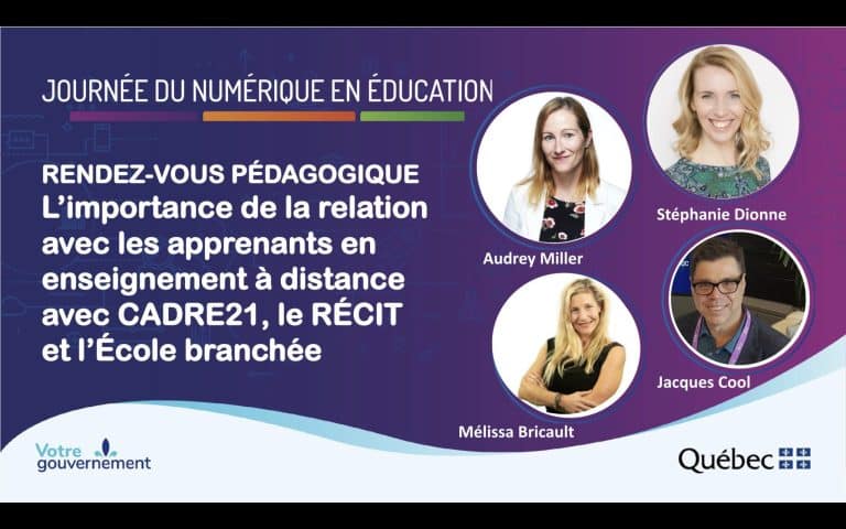 Par la suite, les inscrits ont pu entendre un rendez-vous pédagogique en direct animé par Stéphanie Dionne de l’École branchée. Une belle occasion de discuter de l’importance de maintenir le lien enseignant-élève lorsque l’enseignement se transporte en dehors des murs de l’école.