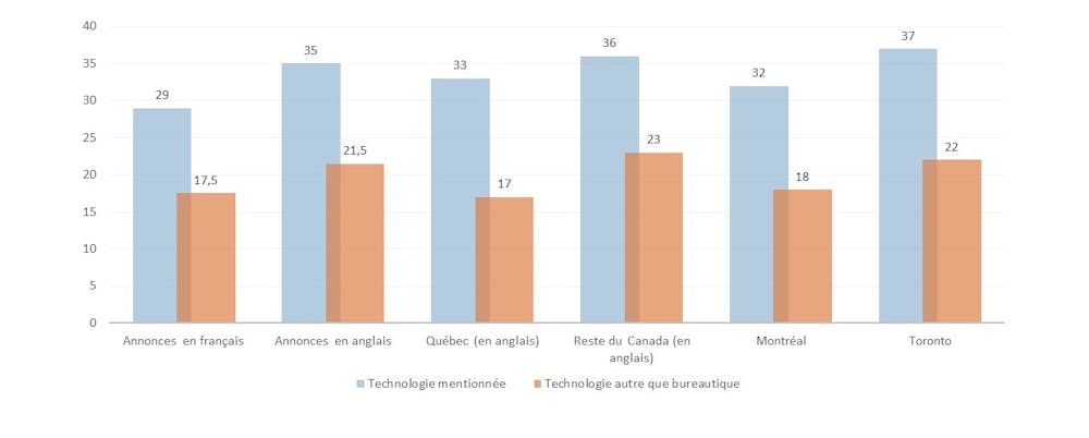 Par exemple, comme illustré à la figure 1, les annonces d’offres d’emplois publiées en anglais tendent à valoriser davantage les compétences numériques que celles en français, tant pour les compétences de base que pour les compétences plus avancées (notamment en bases de données ou avec différents progiciels).