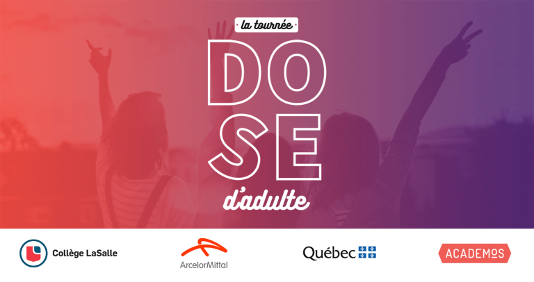 Montréal, le 12 novembre 2019. – Academos part aujourd’hui à la rencontre de 2 500 élèves dans dix écoles secondaires du Québec dans le cadre de la troisième édition de la tournée Dose d’adulte, qui se déroulera jusqu’au 13 décembre en partenariat avec le Collège LaSalle, ArcelorMittal et le Secrétariat à la jeunesse du Québec.