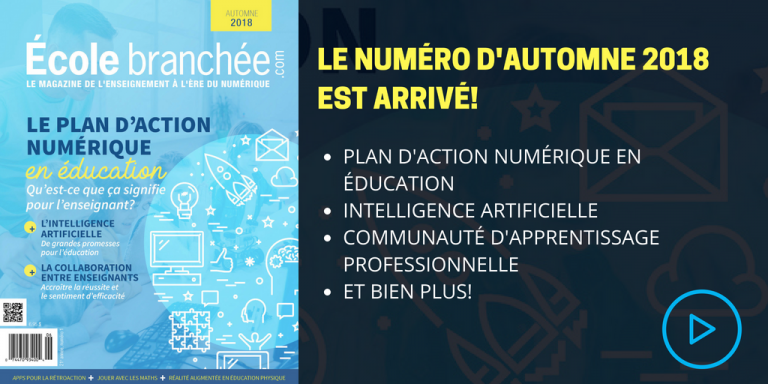 QUÉBEC, le 28 août 2018 – Le magazine École branchée lance aujourd’hui son numéro d’automne intitulé « Le Plan d’action numérique en éducation : qu’est-ce que ça signifie pour l’enseignant? ». Le Plan d’action numérique (PAN) du Ministère de l’Éducation et de l’Enseignement supérieur (MÉES) comprend une série de 33 mesures totalisant 1,2 milliard $ sur 5 ans. Elles permettront au milieu scolaire québécois un meilleur accès à la technologie et à ses usages pédagogiques. Le magazine détaille certaines de ces mesures qui semblent particulièrement intéressantes pour les enseignants. Il propose aussi une foule de ressources en lien avec les grandes orientations.