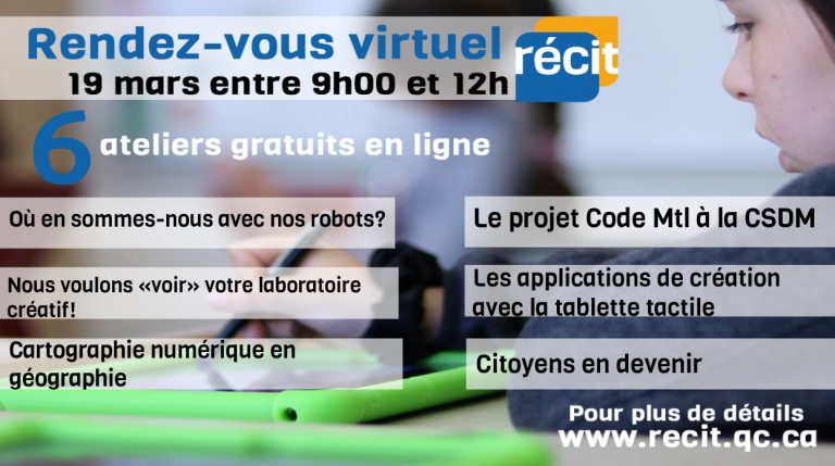 Accessibles peu importe le niveau de familiarité avec les outils numériques, ces parcours incluent une offre d’autoformation disponible sur le site Web du Campus RÉCIT. Le 19 mars dernier, 6 ateliers gratuits étaient offerts en ligne par le RÉCIT afin d’introduire les acteurs éducatifs à diverses thématiques pouvant être explorées dans le cadre du PAN. Les enregistrements de ces ateliers ainsi que les ressources présentées seront disponibles sur le site Web du RÉCIT.