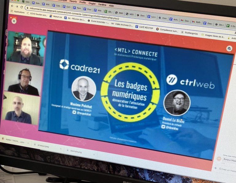 Le badge numérique peut-il devenir un outil de reconnaissance de la formation continue? Voici la question qui a été discutée lors de la conférence de Maxime Pelchat, du CADRE21, et Daniel Le Blanc de CTRLWeb, dans le cadre de l’événement MTL Connecte.
