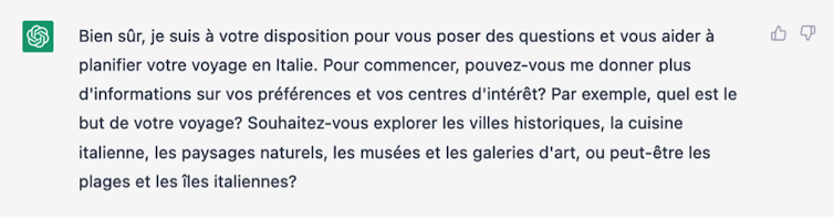 En fonction de vos réponses, ChatGPT pourra élaborer un itinéraire personnalisé qui répond à vos attentes et besoins. (Hugo G. Lapierre), Fourni par l’auteurDans cet exemple, ChatGPT vous posera des questions pour recueillir des informations sur vos préférences de voyage, telles que les villes que vous souhaitez visiter, votre budget, vos centres d’intérêt et vos contraintes de temps, tout en considérant les attractions principales qui se trouvent en Italie. En fonction de vos réponses, il pourra alors élaborer un itinéraire personnalisé qui répond à vos attentes et besoins.