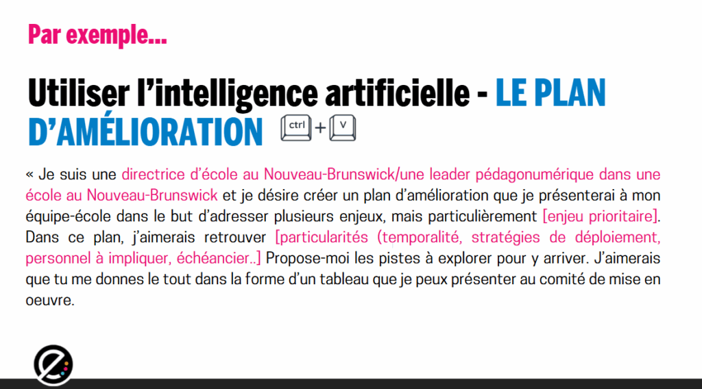 D’autres ont découvert des moyens d’utiliser l’IA pour générer rapidement des plans de suppléance adaptés ou encore bâtir des tableaux de suivi en cybercitoyenneté, afin d’offrir des activités ciblées aux élèves chaque mois.