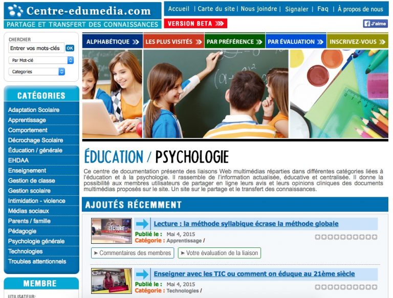 Un nouveau site a vu le jour récemment sur la toile éducative, le centre-edumedia.com. Cette vitrine rassemble des documents multimédias classés dans différentes catégories liées à l’éducation et à la psychologie. On y trouve notamment une intéressante section sur les technologies. Parmi les autres thèmes, notons les stratégies d’enseignement, la gestion de classe, les médias sociaux, les parents, etc.