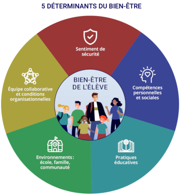 Le Référentiel sur le bien-être de l’élève est un outil numérique interactif destiné à soutenir le réseau dans l’amélioration des différents déterminants qui contribuent au bien-être. Il permet d’établir un portrait de la situation des milieux scolaires et propose un ensemble de ressources permettant d’agir sur le bien-être et le climat scolaire. Son outil numérique interactif d’autoévaluation permet aux écoles d’analyser leurs pratiques à partir de cinq déterminants.