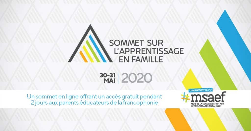 Le Sommet sur l’apprentissage en famille se tiendra pour la toute première fois les 30 et 31 mai 2020 et présentera une dizaine de vidéos en ligne en lien avec les apprentissages en famille. Ces vidéos seront disponibles gratuitement pendant la durée du Sommet, afin de rejoindre une large population de familles francophones intéressées par, ou ayant opté pour, une éducation alternative pour leurs enfants.