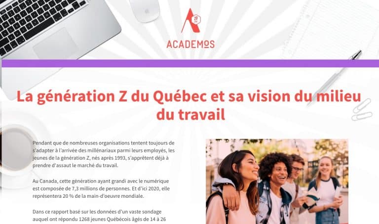 Montréal, le 15 octobre 2019. – Academos dévoile aujourd’hui les résultats d’un vaste sondage portant sur les craintes et les attentes de la génération Z face au monde du travail. Intitulé « La génération Z du Québec et sa vision du milieu du travail », le rapport publié par l’organisme présente huit grands constats sur la prochaine génération de travailleurs, commentés par sept experts de la jeunesse, de l’orientation scolaire et professionnelle, de l’entrepreneuriat et du marché du travail.