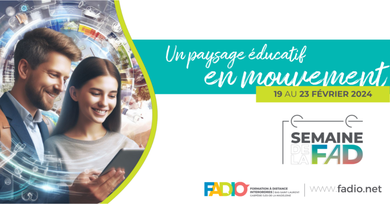 Communiqué – Les établissements d’enseignement du Bas-Saint-Laurent et de la Gaspésie-Îles-de-la-Madeleine, formant le regroupement de Formation À Distance Interordres (FADIO), convient l’ensemble des acteurs et actrices du monde de l’éducation et de l’enseignement supérieur à la 7e édition de la Semaine de la formation à distance (FAD) qui se tiendra du 19 au 23 février prochains.