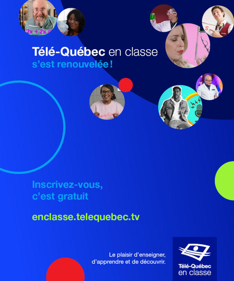 La mission éducative et culturelle de Télé-Québec est bien connue. Depuis sa création, Télé-Québec a touché la jeunesse québécoise par la production de contenu audiovisuel à la fois divertissant et éducatif, en plus de mettre son expertise au service du milieu scolaire. Qui plus est, Télé-Québec enrichit continuellement son offre. Cette fois, elle le fait avec Télé-Québec en classe, une plateforme technopédagogique complémentaire au programme de formation.